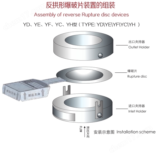 爆破片安全装置放人法兰时,应注意泄放箭头的方向,安装在管道上时不允许装反。